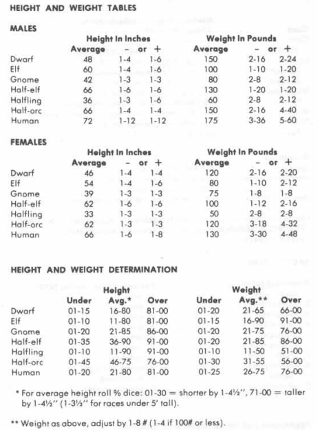 […] addressed means of assessing height and weight through random rolls for AD&D monsters here. In a game, I’d recommend that height and weight get rolled randomly. But, for this example, […]