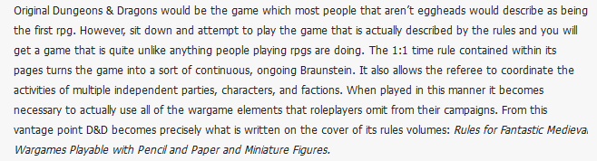 Without going on at length, Johnson’s thesis is that the field of role playing games came about through people misunderstanding what was being done when they watched people play D&D (or were instructed to play D&D), yet, nonetheless, being inspired by the experience. These people, at a time either before D&D was published (or when obtaining the actual booklets was difficult), then went and wrote their own games based on what they thought was happening when D&D was played.