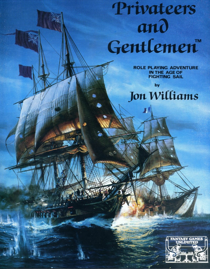 That game is Privateers and Gentlemen. I wrote about the game in 2017 here (Privateers and Gentlemen). Privateers and Gentlemen is a game of Napoleonic nautical sail. The game was published in 1978, the year after Traveller. But it has a feature that Traveller lacked in 1978. Its author, the writer Walter Jon Williams, was strategically located to make just this sort of game. He was from the upper Midwest (Minnesota) and was a war gamer who, anecdotally, was exposed to the early years of D&D within the war game community of that time. And, what did he do? He went out and wrote a game inspired by his experiences with D&D. But, unlike Ken St. Andre, he was a war gamer. When Privateers and Gentlemen was published in 1977 it was in exactly the same form as OD&D. OD&D was the miniature war game rules Chainmail with the Dungeons and Dragons rules published as a means of creating detailed characters with which to interact within a Braunsteined world. Privateers and Gentlemen, according to Walter Jon Williams, as published in 1978, was the Heart of Oak miniature rules plus the Promotions and Prizes supplement detailing how to create individual characters and run battles with them. Note the naming convention used in the original game title plus the “role playing” part mirrors the “blank and blank” format of Dungeons and Dragons. In 1981 a second edition was published that included an additional booklet Tradition of Victory which detailed constructing vessels and encounters on land plus a bunch of historical details.