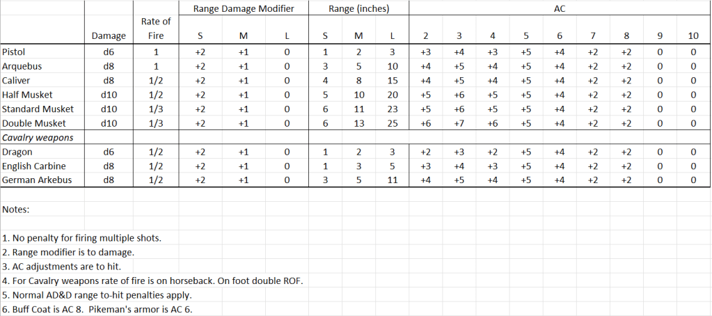 So there you go. If you try it, let me know how it works for you. A few comments. In other treatments of adding gunpowder weapons to AD&D, people have added things like exploding dice for damage, because it seems unreasonable that any firearm doesn’t have a chance of a one-shot kill, and AD&D characters can have many more hit points than any single dice roll. I have not included such here. Why? Because Gygax did not. But, here’s my reasoning.