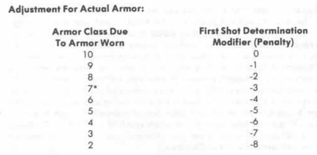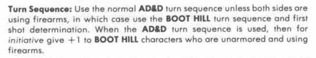 First, a distinction is made between situations where both sides in a conflict are both armed with firearms, in which case it says use the Boot Hill Turn Sequence. But, if it’s mixed firearms and AD&D weapons (and I suppose magic) the AD&D Turn Sequence is used in which case unarmored characters using firearms get a +1-initiative bonus. That’s interesting, apparently firearms are quicker than say a magic user causing a wand or staff magic to function.