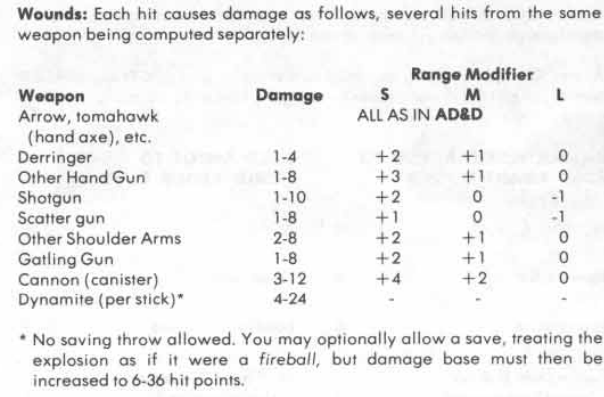 For renaissance firearms, note the footnotes. And be aware that no weapon speed information has been provided. Just use the AD&D standard missile weapon procedures. This is because the renaissance firearms are significantly more unwieldy than the 19th century firearms listed for Boot Hill. If Boot Hill firearms have tied initiative with renaissance firearms, any of the Boot Hill firearms will shoot first.