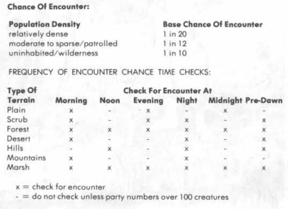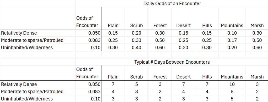 One thing that sticks our here is that the more densely populated an area is, the less likely there is to be an encounter. Huh? Shouldn’t encounters be more frequent in populated areas? Well, no. Look at it this way, these odds are not the odds of meeting people, but the odds of a potentially hostile and/or beneficial encounter. In densely populated areas, one isn’t likely to get devoured by wolves or find a dragon’s hoard. In populated lands, people are just going about their business. So, it looks like the best places to have an encounter are a Forest or Marsh.