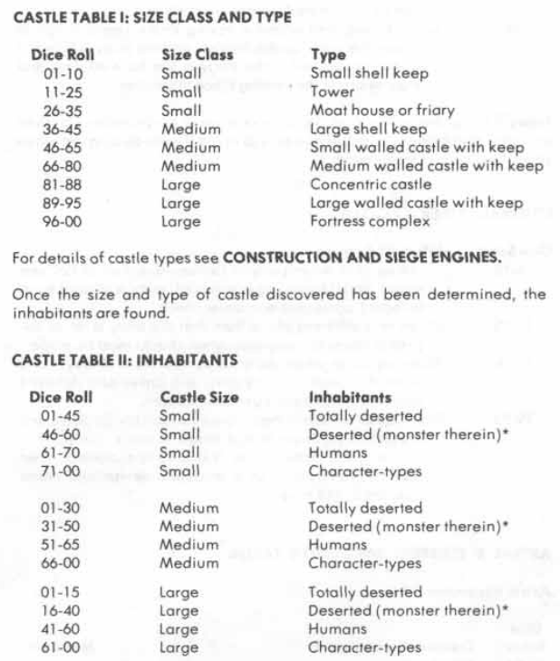 It should be no surprise that encountering castles is pretty rare (1 in 20 duh). Over the course of a year of travel, a character might encounter a deserted castle or two, maybe one or two castles with monsters, maybe a castle occupied by bandits, and two to four with powerful character types. Maybe a castle every month and half of travel time or so. During which there may be dozens or even hundreds of monster encounters. In any case, those castles with monsters are all potential dungeons, and the other castles are opportunities with varying levels of danger associated with them.
