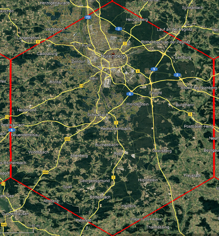But what about those inhabited areas? No castles at all? Only patrols and monsters? That’s odd. Well, again no. Where do those patrols come from? The castles! Or the settlements in general. Appendix B of the DMG (on p. 173) gives details how to generate terrain. The exact language in the section says the DM must use common sense in determining overall terrain but does suggest using “1 space = 1 mile, or larger”. Given that a lightly loaded character can travel roughly 30 miles a day through plain terrain, one common large area denominator is the 30-mile hex. The picture below shows a 30-mile hex containing the area around the city of Nuremberg. Clearly, a 30-mile hex can contain a lot.