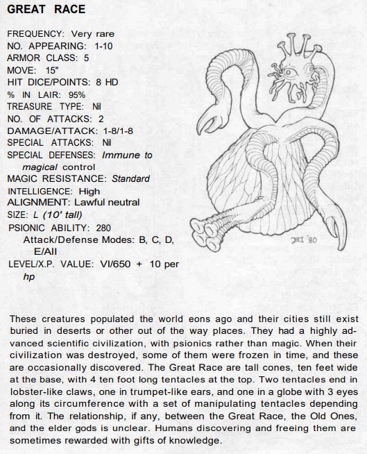 AD&D 1e gets a fair amount of flack for being awkward and clunky. This is mostly from people who haven’t played it for any length of time. Gygax’s rather florid style which challenges their comprehension also plays a part. Yet, AD&D 1e has an elegance that few fully appreciate. AD&D 1e deserves better. One aspect that sheds a light into how elegant AD&D really is, is how it treats the Great Race of Yith.
