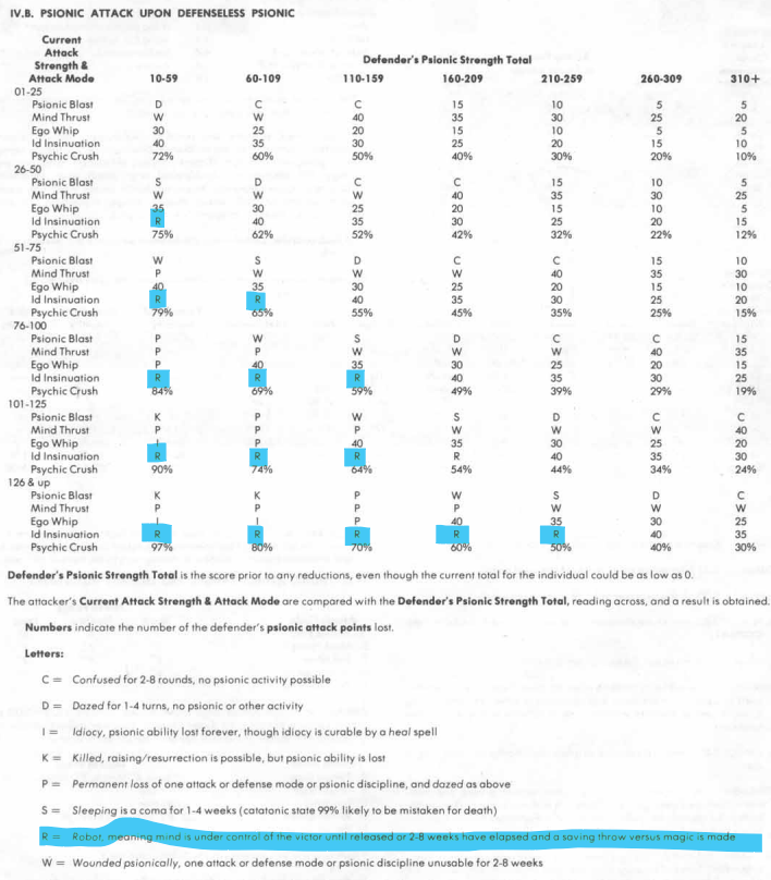 What about mentally controlling the good professor? Well, in AD&D psionics, the attacker picks an attack mode, the defender picks a defense mode which then determines how many psionic points are lost. Psionic points act both as psionic hit points but also as what fuels the attacks, the defenses, and the various other powers. Once an enemy runs out of psionic points, they are defenseless, and various effects can happen depending on the attack mode. For example, Psionic Blast can confuse or even kill an opponent, while Ego Whip can disable defense modes or even destroy another’s psionic ability. The most relevant Attack Mode for the Yithians is Mode E, Id Insinuation. By looking at the table (p. 82 DMG) one can see that only Id Insinuation has effect R. R stands for robot – the loser is mind controlled for 2-8 weeks. Weeks! And, of course, once the effect wears off, the attacker could attack again. A weakly psionic character could be controlled for long periods of time, especially when faced with such a powerfully psionic creature as a Yithian.