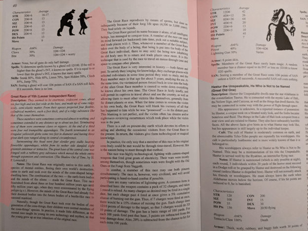 In contrast, the RPG The Call of Cthulhu listing for the Great Race spends a fair amount of time describing the mind swapping aspect of the Great Race but includes no game method for performing it. In the Call of Cthulhu RPG, the mind control/swap is just carried out by fiat. While in AD&D 1e, the ability is there, there is a game mechanism not just for the mind control but also for sending one’s mind through time (astrally) to find the necessary sensitive target. When one puts the pieces together, AD&D clearly beats Call of Cthulhu at its own game. In fact, one might even argue that Call of Cthulhu isn’t a game at all in comparison.
