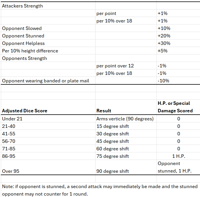 4. Once the attackers roll result has been determined, the opponent may counter. Just as with the attacker roll percentile dice and modify the number rolled by the variables with the opponent now the attacker to get a result. This result is subtracted from the original result to get the degree shift for the start of the next round. For example, if the attacker gets a modified 60 this results in a 45 degree shift; if the opponent then rolls a modified 75 this is a 60 degree shift, leaving the start of the next round at 15 degrees shifted toward the original opponent.