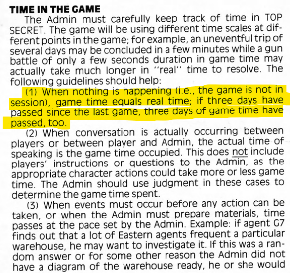 In any case, here is one tiny step toward creating a real feedback loop for Top Secret. You needn’t use mine. It’s not hard to gin up a new random table with odds more to your liking. The point is to close the loop and make your game self-sustaining.