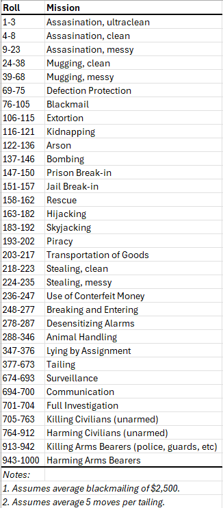 A perusal of the mission table shows some missions are of pretty limited scope. Or variable in reward. Really, a whole session just set around desensitizing an alarm? Well, no and yes. In the later Top Secret Companion, TSR clarified that a “Mission” might be composed of several of the tasks on the mission table list and renamed these things “jobs”. For example a jail break-in might also involve one to desensitize an alarm, blackmail a guard, tail people, and the harm unarmed civilians. But, let’s not forget, players are playing operatives in an intelligence agency. There is no expectation, especially for low level operatives, that the play characters are in on the whole story. It’s need-to-know and you just don’t-need-to-know. So, yes, characters might be assigned to tail someone not knowing that that person is to be assassinated by someone else later. They might be assigned to turn off that alarm not knowing it is to gather blackmail information. Starting characters (and players) need to get used to ambiguity.