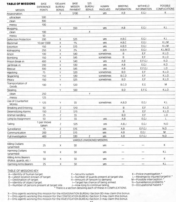 Let’s first take a look at the mission table. Note that for each mission there is a base XP awarded, with some bureaus getting bonus experience depending on the mission type. It has a lot of good basic information from which one can design a mission: type of briefing information, information that might be withheld, and possible complications.