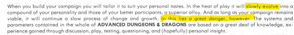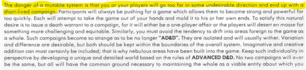 Gygax goes on to say that a mutable system can lead a campaign in an undesirable direction and end up wrecking a campaign.