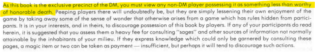 As to the text above I entirely disagree. Here, he avers that the rules in the DMG are the “exclusive precinct of the DM”. He then goes on to discuss all the punishments one should inflict on “peeping players”. Gygax is entirely wrong here. Players not only should read the DMG and know the rules, they should help the referee remember the rules. This is not “rules lawyering”. This is knowing and playing a complex game in a cooperative fashion (even though it is also a competitive environment). Players have the right to know the rules of the game and the right to expect that the rules do not change except in well-considered fashion. I dislike the term Dungeon Master because the referee has authority but is no master. Or, should not be. The referee is just another role to be played in the game.