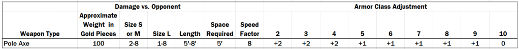 Let’s face it, does AD&D 1e really need another pole arm? Not really. Gary Gygax already provided a pretty detailed list. Plus, given the variation in historical pole axes, the already present statistics for the Lucerne hammer or the bec de corbin are already probably a good enough representation of the pole axe.