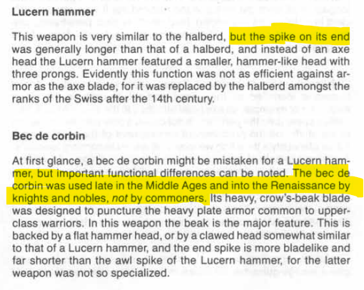 So, according the Gygax, the bec de corbin is a knightly weapon while the Lucerne hammer is not. And, the Lucerne hammer has a longer spike. Maybe it’s this spike that aids in the dismounting? Anyhow, the bec de corbin now looks to fit the pole axe bill. Hold it, it’s not a bill. A bill is another type of pole arm.