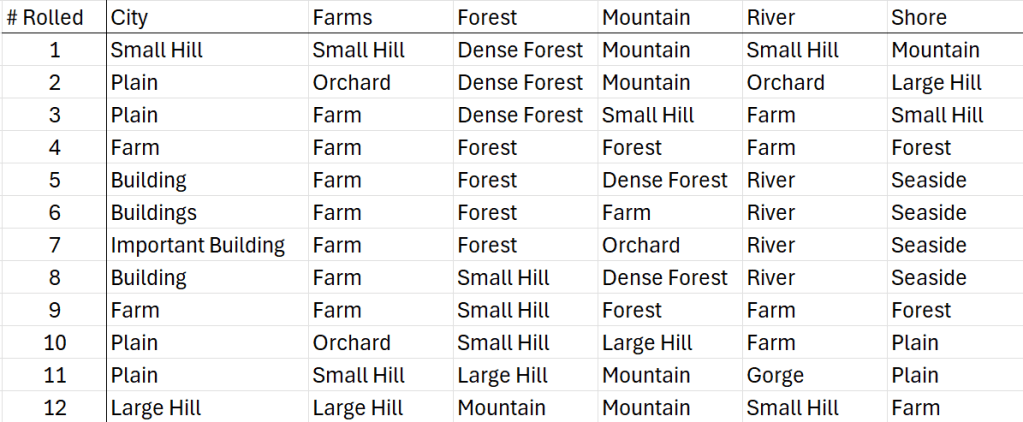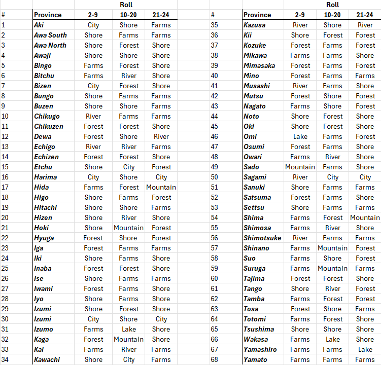 1. Roll 2d12 on the provincial table for the province in which the battle occurs to determine the base terrain type. If a player has a ninja, he may elect to use the ninja to choose the base terrain type. Note: if the province has a castle, the castle will be on the field placed by the owning player.