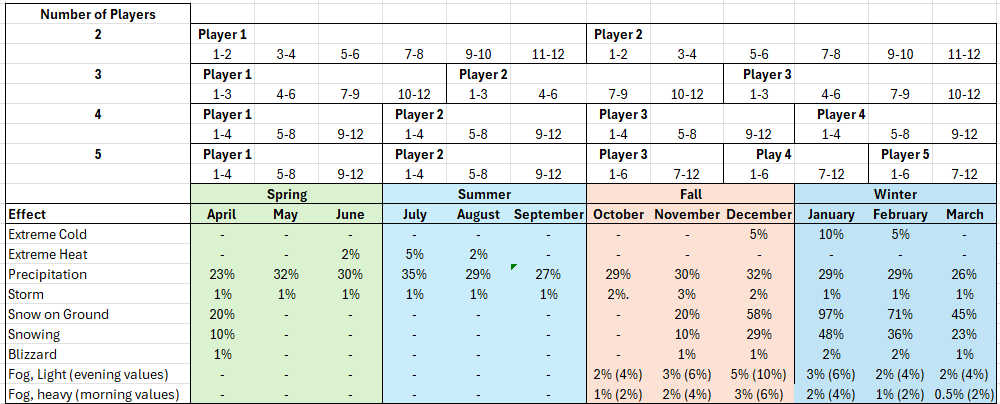 9. Designate time of year and weather (I assume one round of play represents a single year). Roll on the Season Chart for the number of players. The Player who initiated the battle rolls based on his position in the current round sequence. Once a month has been determined, roll each of the percentages to determine any environmental effects that might occur. There can be multiple effects simultaneously. Wait to roll for fog until after the next step (starting hour). For fog, the value in parentheses is to rolled when precipitation has already been determined to occur — in which case it is vision obscuring rain.
