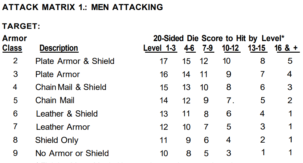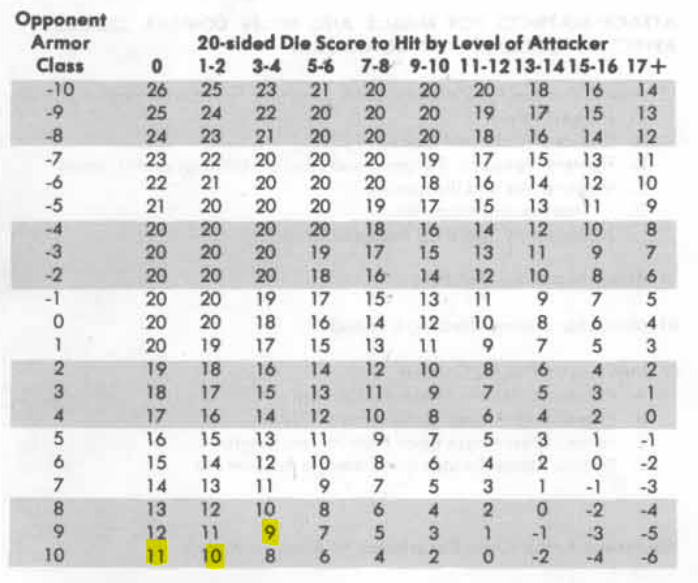 Advanced Dungeons and Dragons (AD&D) expanded the scale downward a bit. There is a level zero which needs a twelve to hit AC 9. Plus, they added a variety of attack tables for different classes. The 10 to hit AC9 doesn’t appear in the fighter attack table, but the OD&D value would be somewhere between second and third level. But AC9 in OD&D is really AC10 in AD&D. In OD&D the lowest level (1st) has a 55 percent chance to hit an unarmored opponent, this is the same for a first level character in AD&D to hit AC10 (unarmored). So, really, it’s the same system with the armor class scale expanded and level 0 added below level 1.