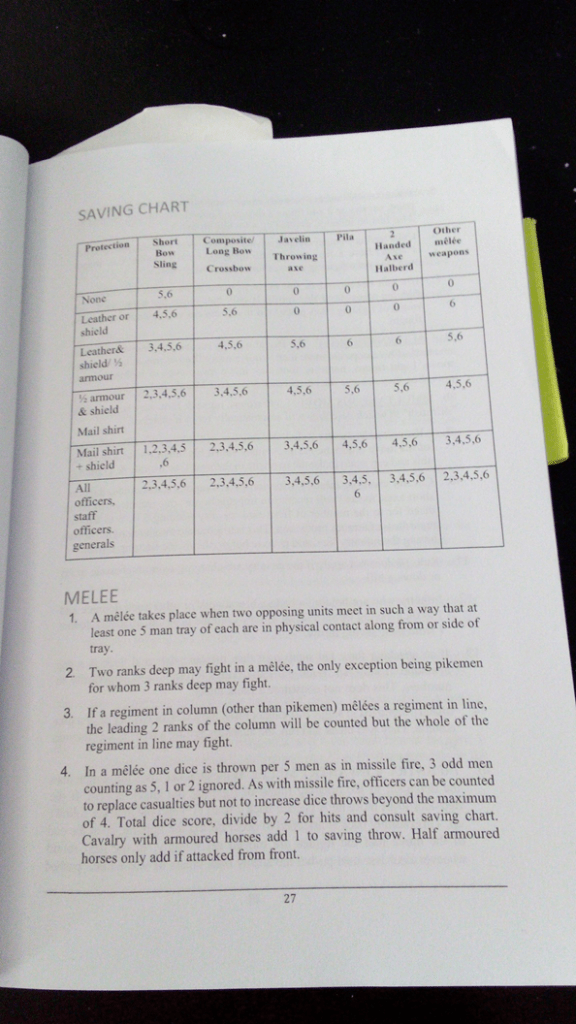 Well, not exactly. For Bath, this is a mass combat system. In simple terms one rolls one die for every five men attacking, sums the dice up and then divides the result by two to determine casualties, then each casualty gets a saving throw using the numbers on the table. For normal melee weapons, unarmored units get no saving throw, but the better the armor, the better the saving throw. The upshot then is that for every unarmored figure, that divide by two means fifty percent odds of survival. This may not be strictly true in all cases but, it’s something like that.