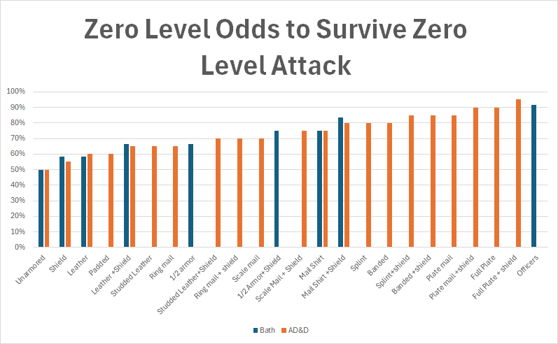 So, I then went and calculated the odds of surviving an attack using Bath’s system. Then I did the same for AD&D. Now, I needed to make some assumptions. The first being that for low level (or zero or first level) characters, that the average damage roll will kill such a character. A typical 0-level mercenary in AD&D has 4-7 hp with an average of 5.5 hp. The average spear might do 3.5 hp damage, and even a broadsword 5 hp average damage. So, maybe this isn’t a great assumption for AD&D. But we must remember that in OD&D the hit dice are based on Chainmail and are d6s, so then a common soldier would have 3.5 average hp. In any case, I went with the assumption that an average D&D hit kills.