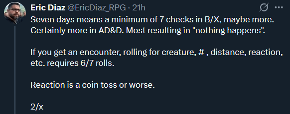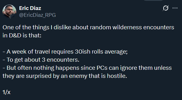 This post is inspired by this X post discussing random wilderness encounters. He’s not wrong. But, he’s not right, either. I’ll explain.