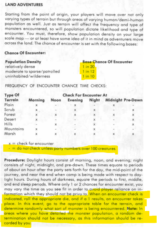 So, he’s not wrong, there is a lot of rolling. But it can be reduced by following the last line I’ve highlighted from p. 47. “In areas where you have detailed the monster population, a random determination should not be necessary, as this information should be recorded by you.” Fair enough. The p.47 process isn’t the only possible way to generate encounters. But, there is a hidden benefit by going through all the rolls.