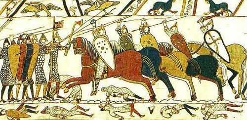 We see a shield wall with a man out front with the Dane Axe. The man is not in a formation of men with Dane Axes. The thought is that the axe men might well be there to chop the lead horse, which then would like dominos disrupt the rest of the charging cavalry. There are a few other things to note. First, the spears born by those in the shield wall don’t look particularly long, nor are they set in the ground to receive a charging horse. Second, the charging cavalrymen, while well armored themselves, their horses are unarmored. Third, the horsemen themselves are not charging with couched lances. This is Hastings, which is pretty early in the history of the knightly charge with lances.