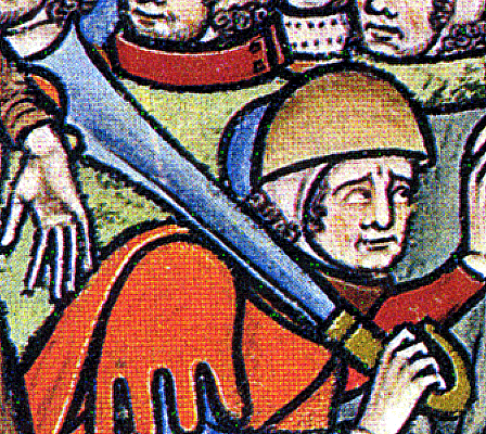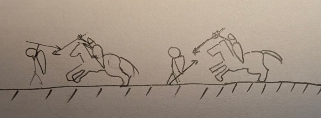 But back to the spear. The length of the spear shown in AD&D is 5′ to 13+’. Quite a variation in length. From the Bayeaux Tapestry, I take the spears of the Battle of Hastings to be on the short end. In geometry terms, If one has a short spear, and it’s butted into the ground, then the horseman that does not need to butt his spear, may well be able to reach the footman before the footman can reach the horse.