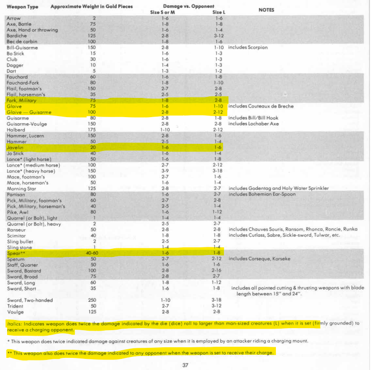 The spear in AD&D is a pretty robust and pretty optimized weapon. I’ve discussed this before here. The spear is cheap, can be packed into tight formations, and has the ability to be set against charges. There are several weapons that the game allows to be set against charges, the military fork, the glaive, the glaive-guisarme, even the javelin. But all these can only be set to do double damage against large opponents. So, really, primarily the large opponents will be horses. The spear has the unique ability to be set against all charges of whatever size.