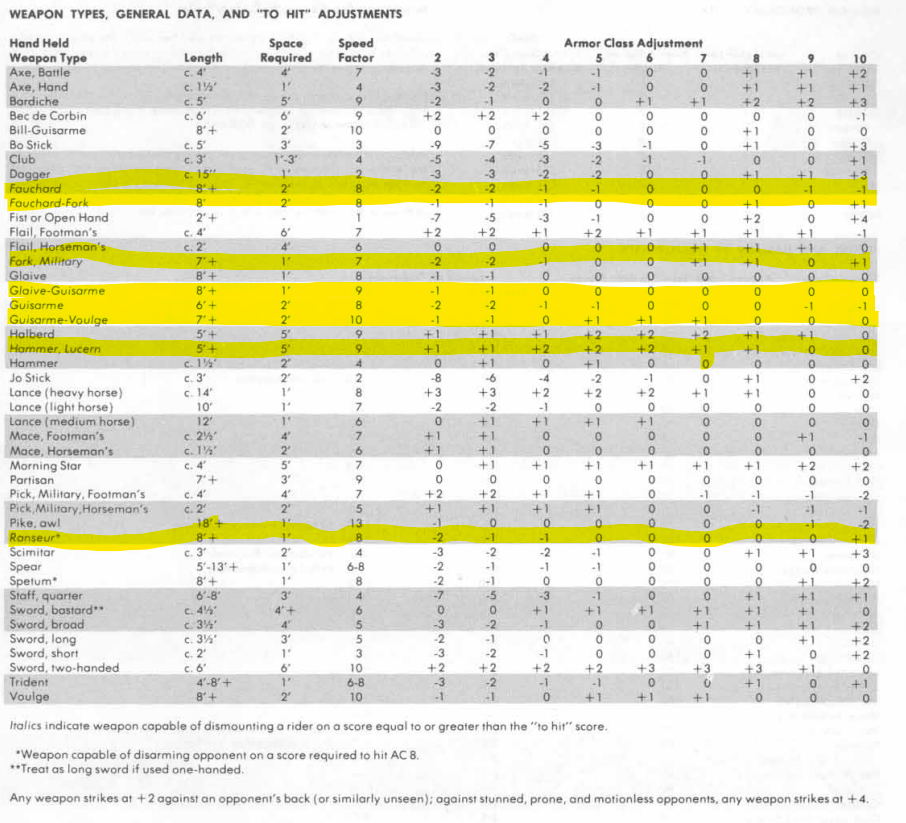 There is another class of weapons in AD&D, while not specifically anti-horse, are anti-cavalry. These are weapons capable of dismounting a rider, the fauchard, fauchard-fork, military fork, glaive-guisarme, guisarme-voulge, and lucern hammer. Some of these have both the ability to do double damage to large creatures or to dismount a rider. Presumably, the wielder of the glaive-guisarme, for example, must choose to either set the weapon and attack the horse, or not set the weapon and try to dismount the rider. Or, this may be taken out of one’s hands should one lose the initiative and not have the opportunity to set the weapon for the charge.