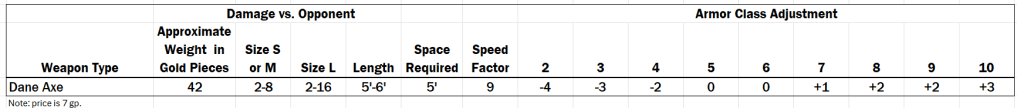 Now, it is reasonable to argue that AD&D includes a battleaxe listing and that should be sufficient to represent the Dane Axe. And, generally, sure, probably so. But battleaxe as listed doesn’t quite fit the use case of the Dane Axe. Damage against large creatures for the battleaxe is a mere 1-8 hit points. And, while the battleaxe does get some negative bonuses against the heavier armors, they are right in line with many weapons. My take is the battleaxe listed in the PHB is intended to represent a later medieval axe built more robustly, but without the same wicked thin edge of the Dane Axe.