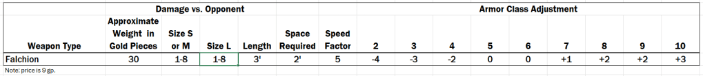 In summary, if one wants to add a little flavor to one’s game, here are the Dane Axe and the Falchion for AD&D. And, for those referees running games, one might start asking pointed questions as to the length of PCs spears, when adjudicating issues of weapon length. Those who take the longest of spears to get that first hit, should have problems maneuvering them in dungeons, and revolving doors.