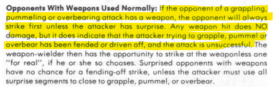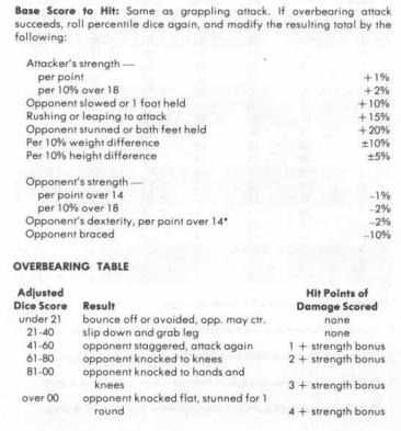 It’s interesting to note that later editions of D&D added a whole slew of dragon body part attacks wing buffets, tail swings, etc. and people thought that was a pretty cool thing and remarked that it really spiced things up from the “simpler” AD&D dragons. But, such attacks were there all along. What is a “wing-buffet” but pummeling? What is a tail sweep but overbearing? What is being grabbed and carried off in a dragon’s claws but grappling? One just has to do the work of following the rules. And, use one’s imagination to determine the unarmed combat ability statistics for dragons (or other creatures.