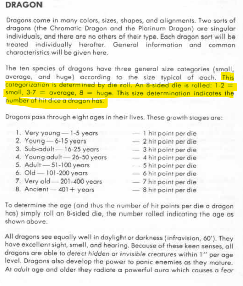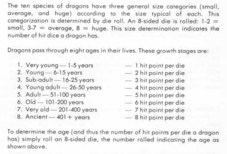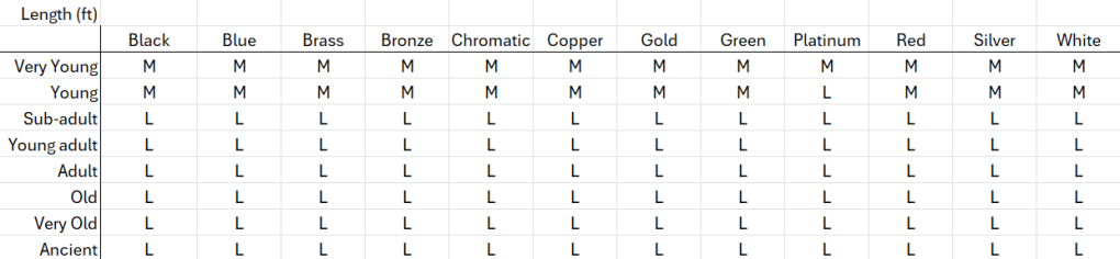 For dragons, it’s a little tricky. Dragons have eight age categories and three size categories that do not match up with the other monster size categories. Only one length is given for each dragon type.