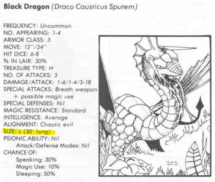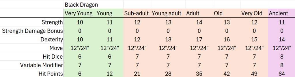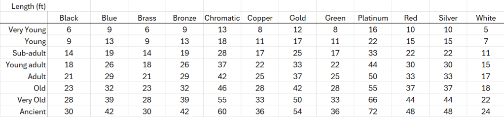 For example, here we see a black dragon is large and 30 feet long. But what age does that correspond to? Who knows? For my purposes I chose that to be the size at maximum growth and then scaled that down for the age categories.
