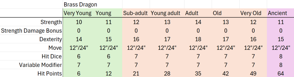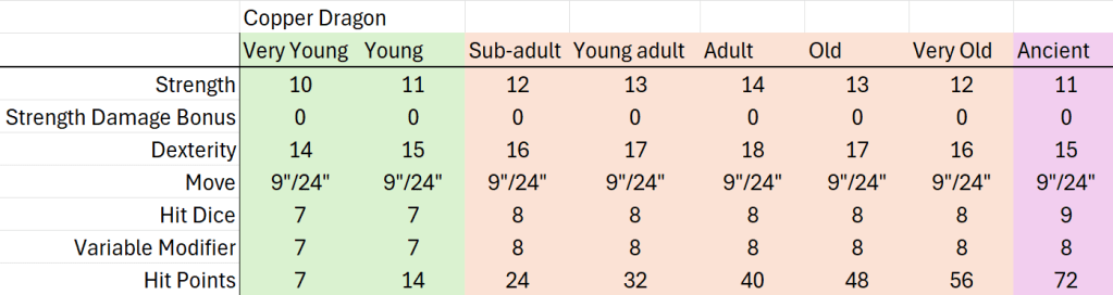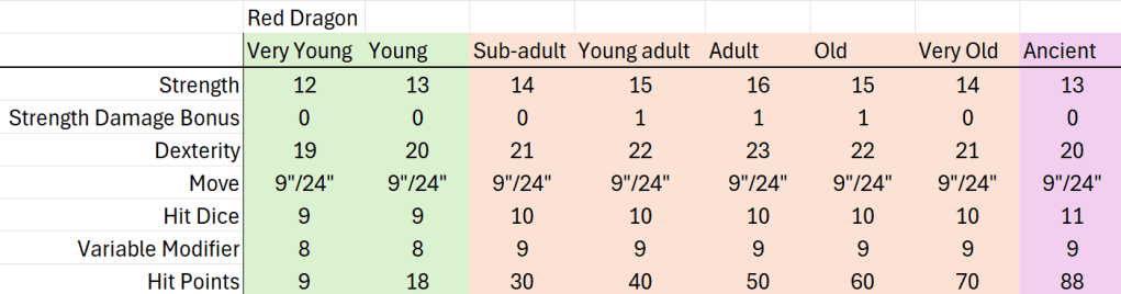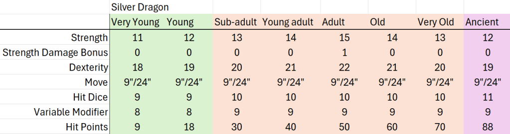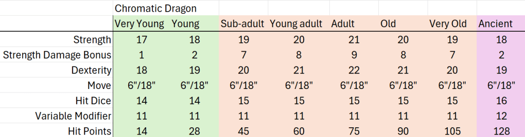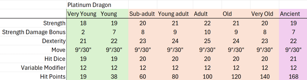 From reviewing the tables, you can see I chose to favor dexterity over strength, for while full-grown dragons can be quite strong, I think dragons are more known for their sinuous snake-like abilities. I also had their strength and dexterity increase with growth and decline with old age. While an ancient dragon may be at their maximum hit points, they are behind their physical peak. For the singular ancient chromatic and platinum dragons, I cast backwards to assume their younger hit dice and physical abilities. While these