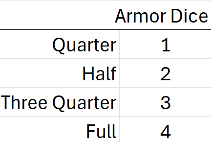 5. Armor. The Coverage Table sets the number of dice available for the defender. The Protective Value Table gives the dice type that are used. Before play, the Defender chooses the apportionment of dice types. For example, a character has bought full chain armor. Full allows for four dice total. A character might put all four dice on Slash, affording themselves 4d8 protection against slash, but then undefended versus Peirce and Crush. Or, he might choose to divide two dice each to Slash and Crush, which would give him 2d8 versus Slash and 2d4 versus Crush. Or whatever permutation he chooses. Once chosen, the dice are set for that suit of armor. When buying armor, the price is multiplied by the proportion purchased — half armor is half price.