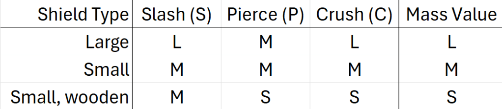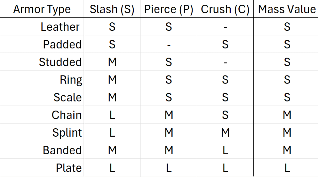 2. Each weapon has a rating for each of the three attack modes of Small (S), Medium (M), or Large (L). Likewise, each armor type has an S, M, or L rating of how effective it is against each attack mode.