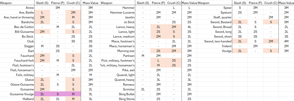 4. Some weapons get combined attack modes. On the Weapon Table, the orange shaded must be taken together, unless one chooses the unshaded third value. Similarly, Purple values, the attack shall choose any two of the three values.