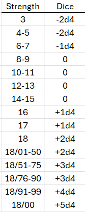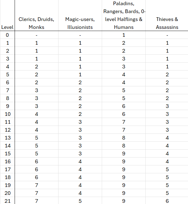 Obviously, this is not a refined system yet. I don’t have a good feel for how well it works. Or, whether it’s fun. I’d love to get feedback from anyone who tries it. Note: this is not house ruling. It’s an experiment for potential use in later game developement. Using AD&D as the structure is just for convenience.