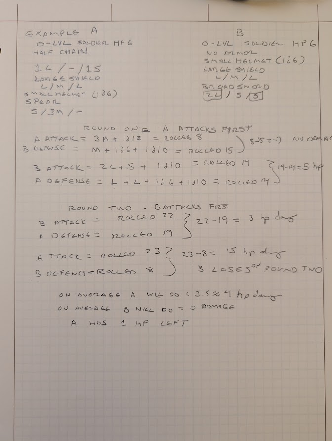 In this example two differently equipped 0-level soldiers fight. Soldier A has an advantage on average. And, Soldier A did win. But, A ended the fight with but one hit point left. It could easily have gone the other way.