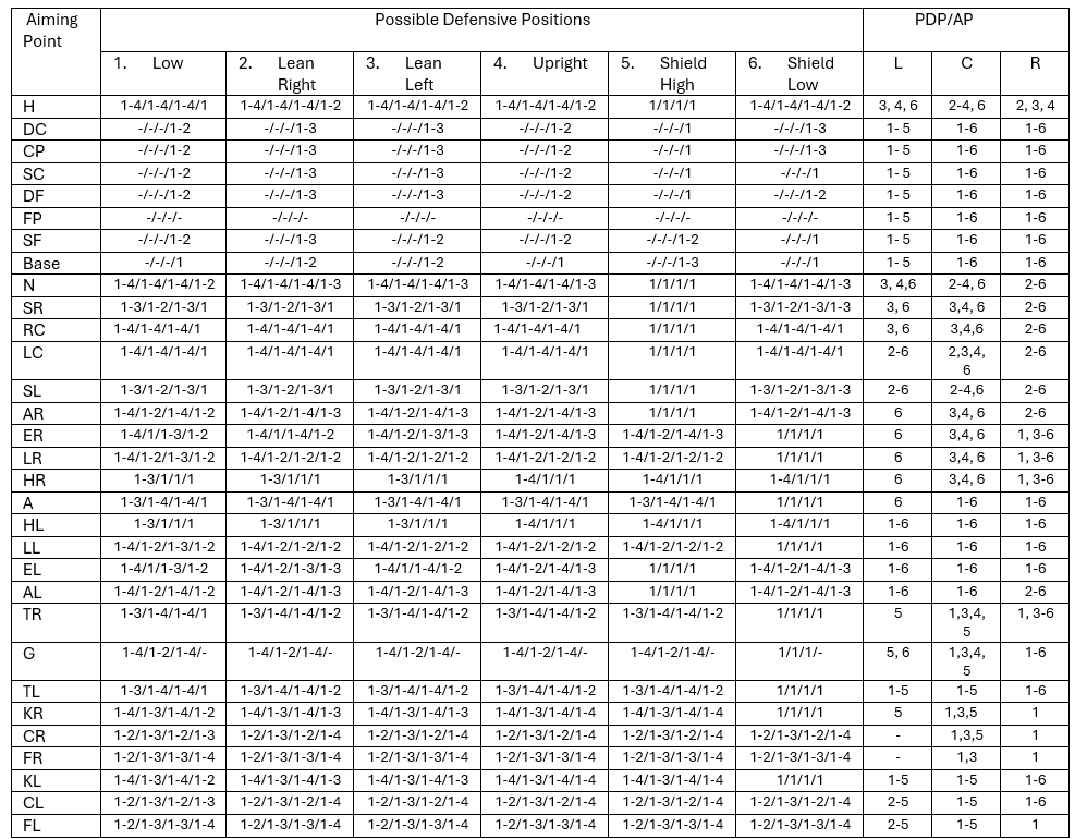 Each character is required to pick an Aim Point and a Defensive Posture, and Damage type to be used based on the weapon. Some Aim Points are not possible given an opponent’s Stance, Defensive Posture, and whether they are equipped with a shield. The Attack Matrix shows for each Aim Point and Stance which Defensive Postures are available.