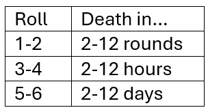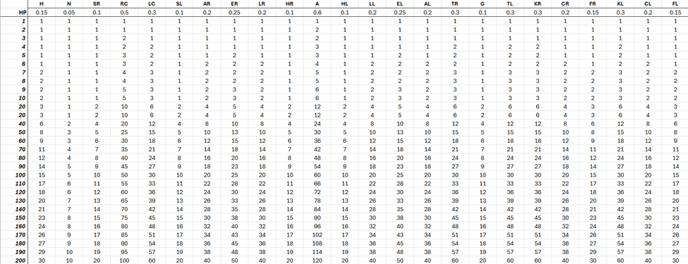 Each aim point can sustain only a proportion of the character’s total hit points before it becomes unusable. The table below allows looking up a character’s total hit points and determining the proportion for each part. Note that taken together, this adds up to more than the character’s total hit points. The exact proportions are shown at the header of the table if people want to get finicky and calculate their own exactly. The quicker method, if there is no exact row for your character’s hp, is to round up to the next highest row and use those values – don’t worry it’s close enough.