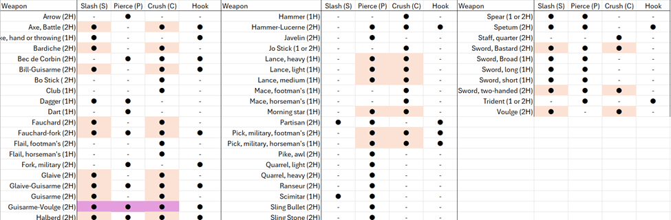 Each Weapon Type has modes of attack. This include Slash, Pierce, Crush, and Hook. The weapon table shows which modes are available to each weapon type. The attacker chooses which mode he is using prior to rolling to hit. Those modes marked in orange are applied together. For example, the Battle Axe slashes and crushes simultaneously whereas the Hand axe only slashes. Both the Battle Axe and Hand axe can choose to forgo the other modes and hook.