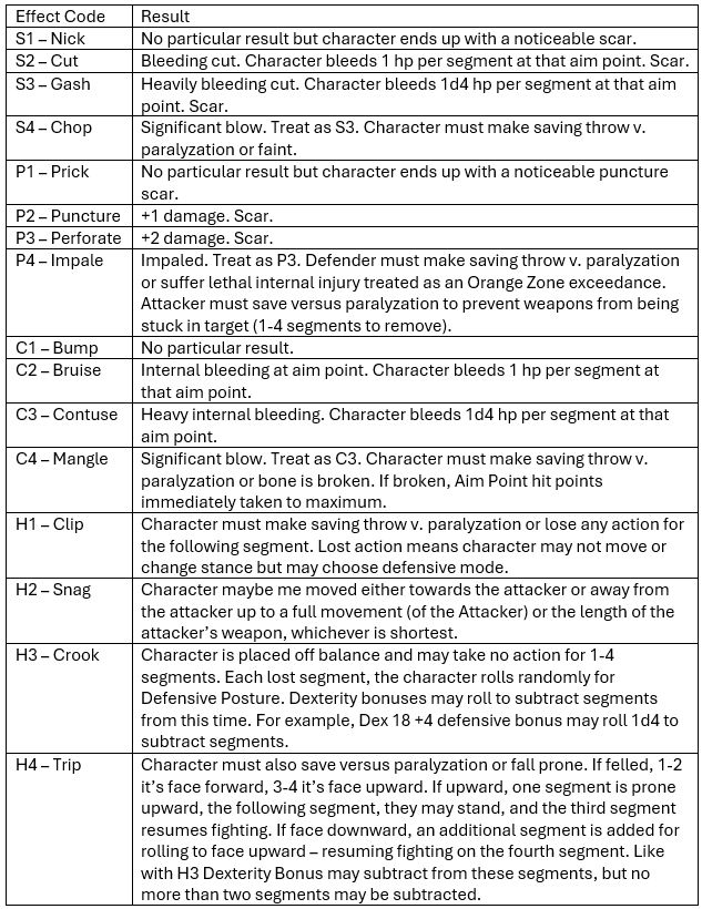 After a successful hit, the Defender’s Defense Mode is cross references with the Attackers Aim Point to determine the Hit Effect. Each box list effects for all four attack modes is the order of Slash, Pierce, Crush, and Hook. For example, 1-4/1-2/1-2/1-4 means to roll for the Slashes 1-4 for effect, Pierces and Crushes roll 1-2, Hooks 1-4. The table below describes these effects.