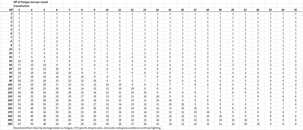 At the end of the tenth segment of combat, fatigue is assessed. Any standing character takes hit points of (non-fatal) damage of fatigue based on their hit point total and constitution score. Use the row of the table rounded to the row of your nearest hit point value. If a character’s hit points drop to zero or lower from fatigue, the character collapses unable to continue.