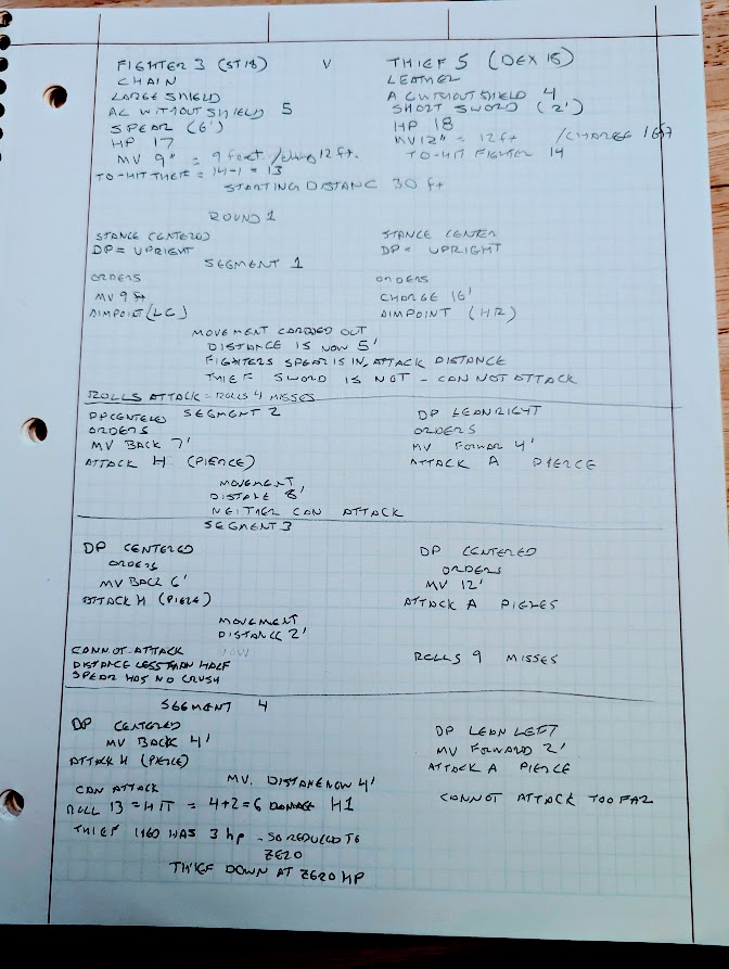 3rd level fighter in chain and shield with spear versus 5th level thief with short sword. This one hinged on managing distance. The thief needed to get close to use his sword and minimize the fighter’s ability to use his spear. The fight took 4 segments. There was no segment where both could attack. The first segment the fighter missed. The second segment neither could attack (both out of range). The third segment the thief could attack but missed. The fighter could not attack because his spear was at less than half its length and has no crush aspect. The fourth segment the distance was too long for the thief but the fighter could attack. Fighter succeeded with a head shot (effect rolled as P1) which dropped his opponent. But the thief, felled only by a single head shot is considered at 0 hp and could be revived with first aid though he’ll sport a distinguished scar.