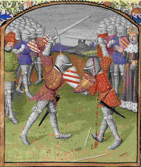 Another option: judicial duels between a man and a woman. The man is placed in a hole and is armed with a club. The woman is on foot and armed with a rock wrapped in sheet. Treat the woman’s weapon as a horseman’s flail. The woman may choose only waist up target aim points. The man may only choose waist down target aim points. Neither side has a shield, but if you’d like a more extended duel, shields might be added to one or both sides.