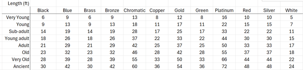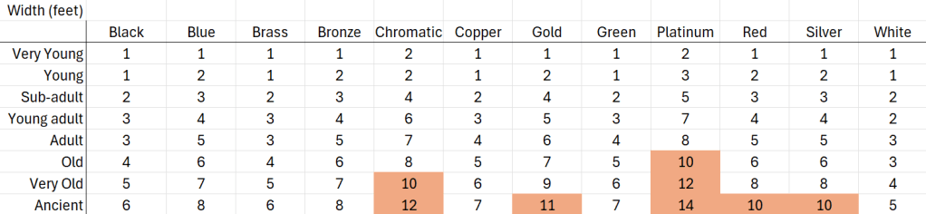I’ve written of dragons a bit before, here and here. I realize I did some analysis of dragon dimensions for AD&D already as part of estimating the carrying capacity of dragons for jousting. The assumptions here being that the lengths of the dragons listed in the Monster Manual represent fully grown examples, and that the younger ages of dragon are smaller. Similarly, I’ve assumed an aspect ratio of Length to Width between 5 and 8, with this ratio getting smaller as the creatures ages. That is, like lizards (and people for that matter), dragons tend to be born slimmer and get stockier with age.